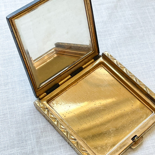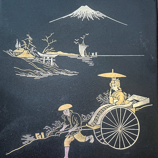 SOLD Vintage Japanese Damascene WWII Era Compact, 24K Gold Silver Inlay, Japanese Scene