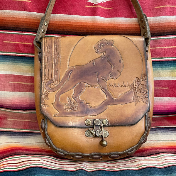 SOLD Vintage Hand Tooled Leather Shoulder Bag, Leopard/Wild Cat