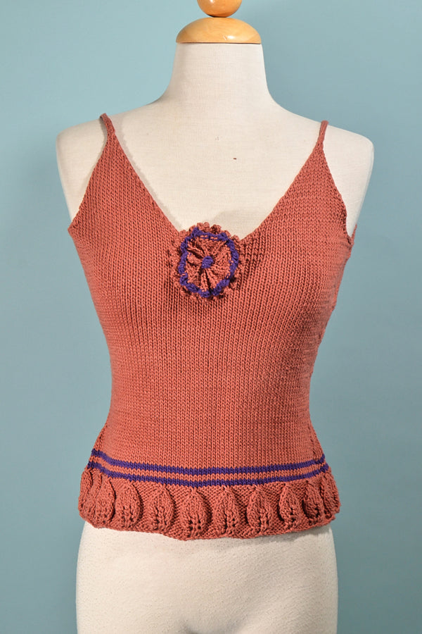 SOLD Vintage Knit Top with Flower Detail, Hand Knit Top S