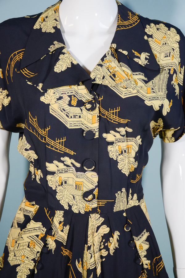 Vintage 40s Navy Asian Novelty Print Dress, Tassel Detail Draped Skirt 28" Waist