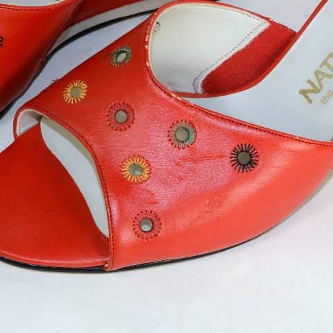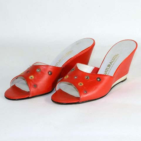 Vintage 60s Red Leather Slip On Wedge Peep Toe Sandal, 9M AS-IS Costume/Study