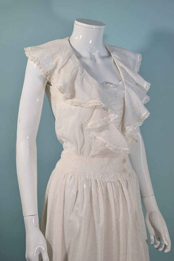 SOLD White Ruffle Neckline, Sleveless Wrap Dress + Sash Tie at Back 28" Waist