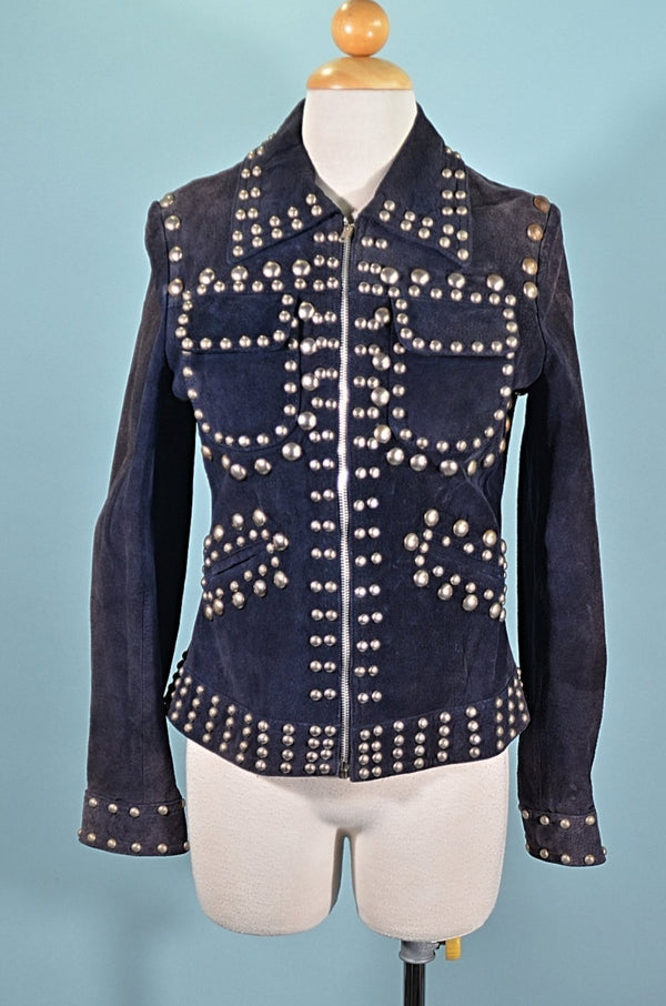 Vintage 70s Navy Suede Studded Jacket by Wolf Brothers, Heavy Wear