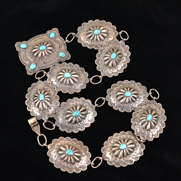 SOLD Vintage 1930s Navajo Native American Silver Turquoise Repousse Concho Belt 143.7 Grams