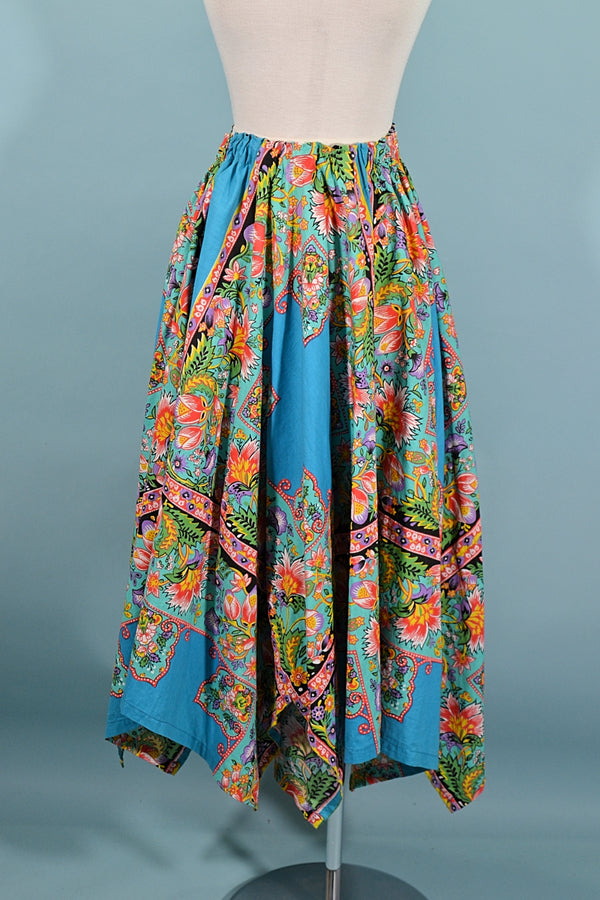 SOLD Vintage 1970s Handkerchief Point Floral Print Midi Skirt, Adjustable Elastic Waist S/M