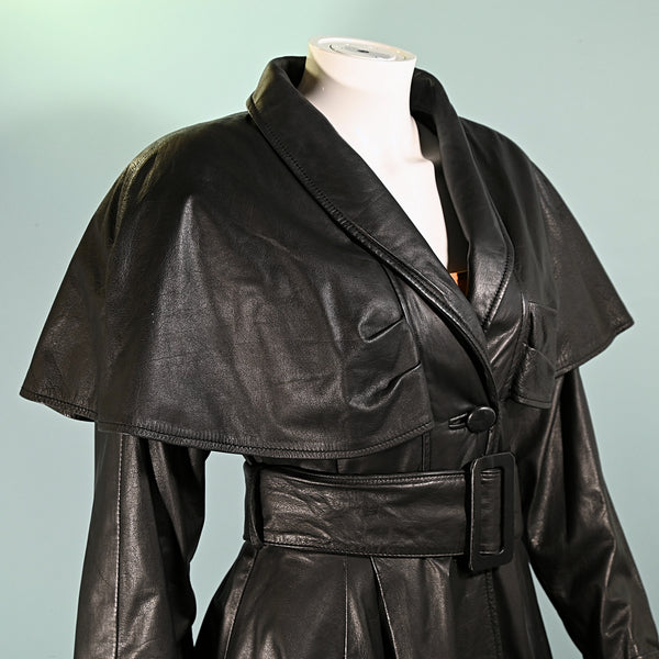 SOLD Pelle Studio Vintage Black Leather Coat with Capelet, Wasp Waist Fit & Flare S