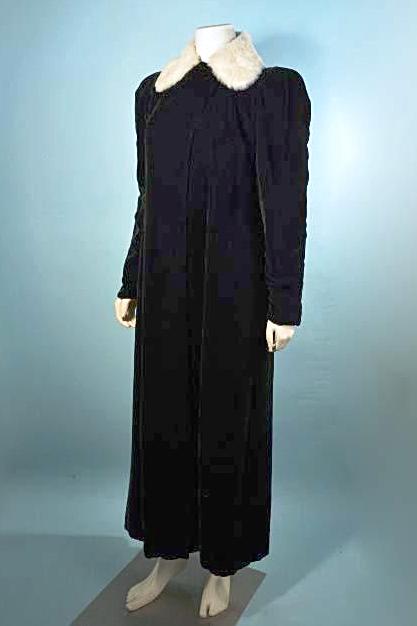 SOLD Vintage 30s Black Velvet Coat + Rabbit Fur Collar, Art Deco Evening Wear Coat S