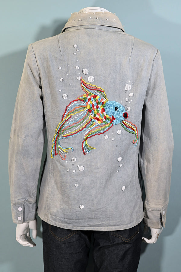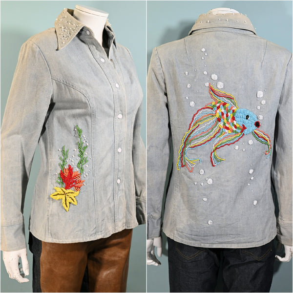 SOLD Vintage 60s/70s Denim Shirt, Beaded Fish Coral Sea/Beach Theme, Arleen