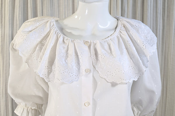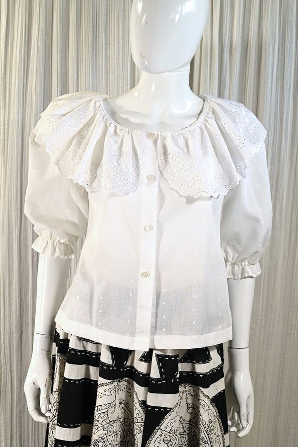 SOLD Vintage 60s White Ruffle Blouse, White Eyelet Collar