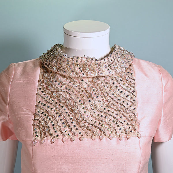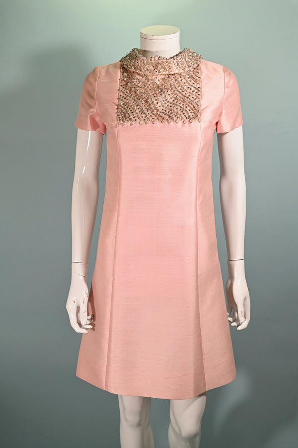 SOLD Vintage 60s Mod Pink Party Dress, Jeweled Neckline A Line Mini Dress, XS/S