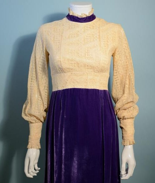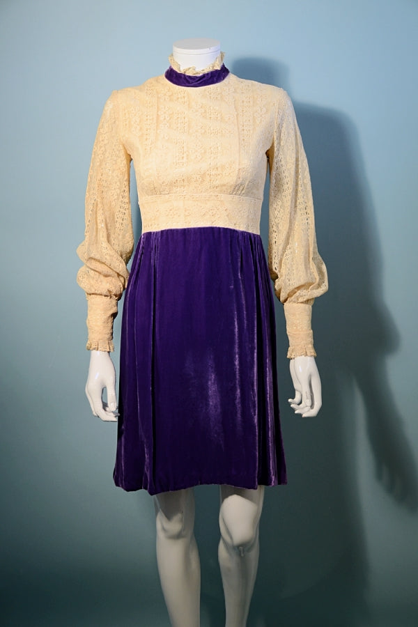 SOLD Vintage 60s Mod Purple Velvet + Lace Empire Waist Party Mini Dress XS