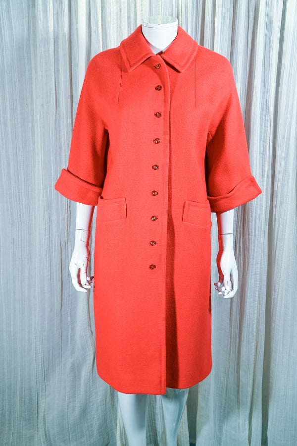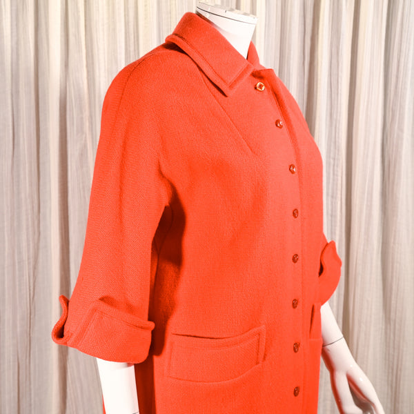 SOLD Vintage 60s Red/Orange Wool Coat, Bracelet Length Cuffed Sleeves M/L