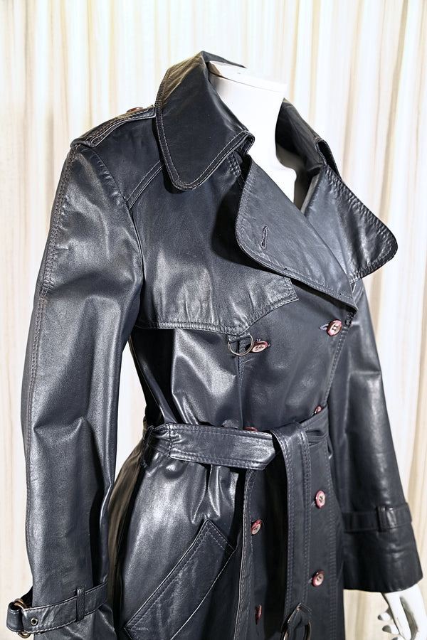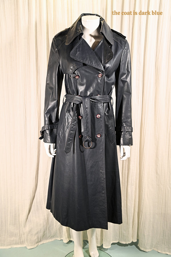 SOLD Vintage 70s Dark Blue Leather Trench Coat