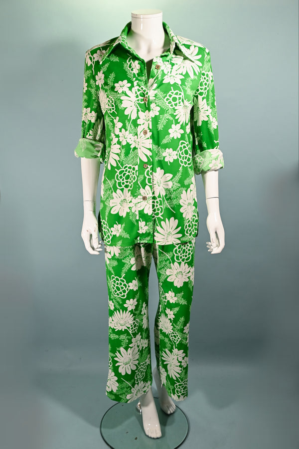SOLD Vintage 70s 2 Piece Pant Suit, Bright Flower Print Polyester Suit