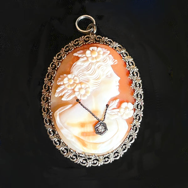 14K White Gold Antique Cameo Pendant/Brooch, Antique Victorian Habille Cameo