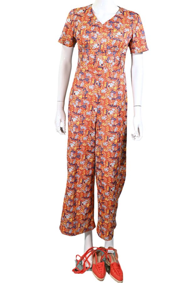 60s Floral Print Jumpsuit, Poly Ditzy Print Pants S