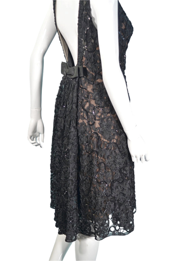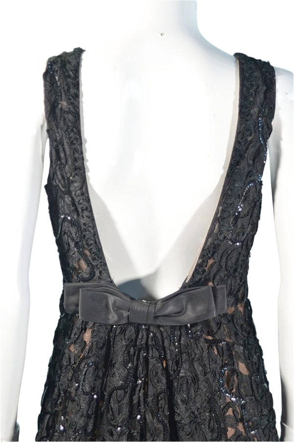 60s Black Lace Sequin Dress, Soutache Ribbon Deep V Back Cocktail Dress M