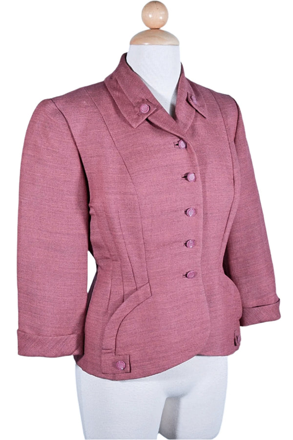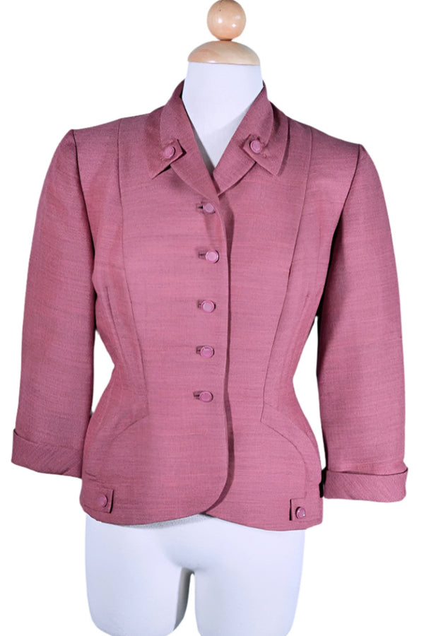 50s Pink Wool Silk Fitted Jacket, 3/4 Sleeve Petite Size S