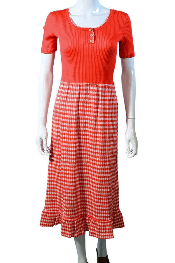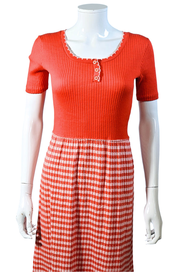 1960s Red Gingham Cottagecore Knit Midi Dress M