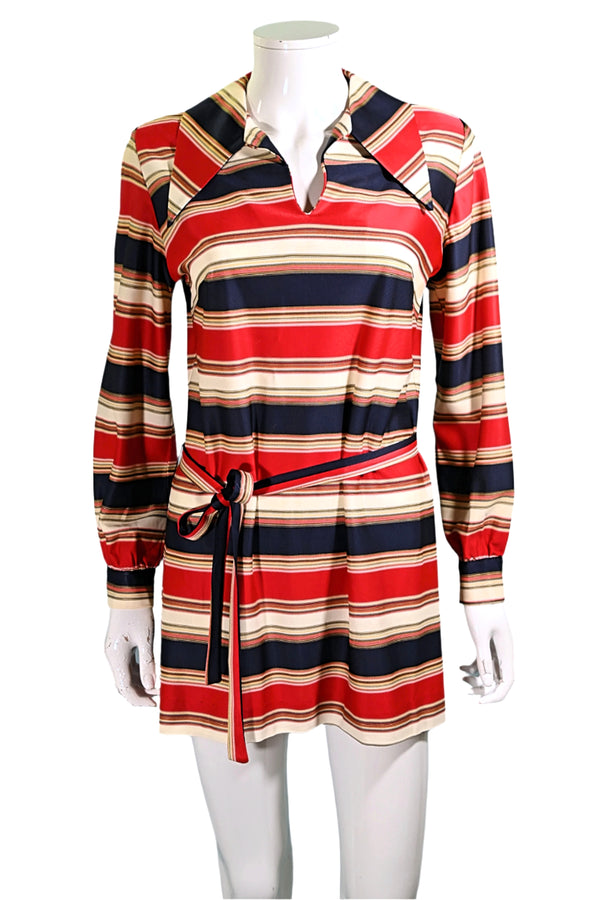 60s Micro Mini Shift Dress w/Belt, Striped Mini Dress S