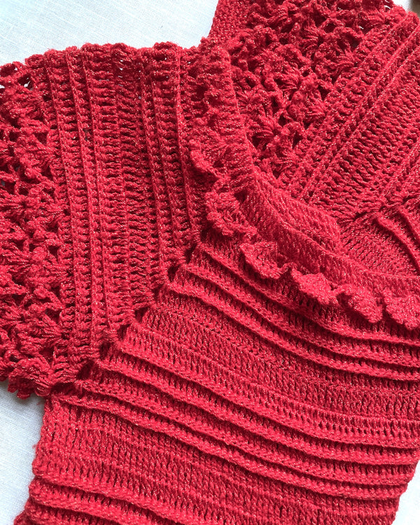 60s Crochet Mod Mini Dress, Red Gold Acrylic Dress S