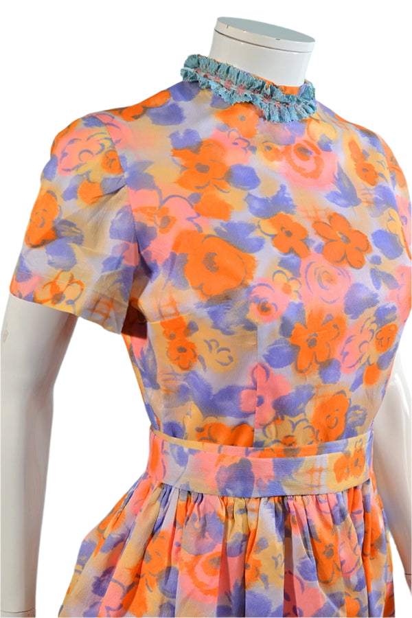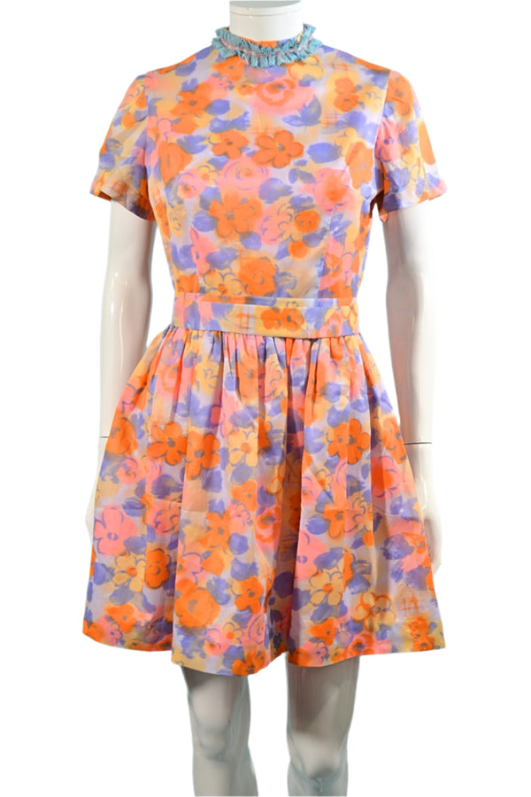 60s Bright Floral Print Mini Dress + Matching Belt S/M