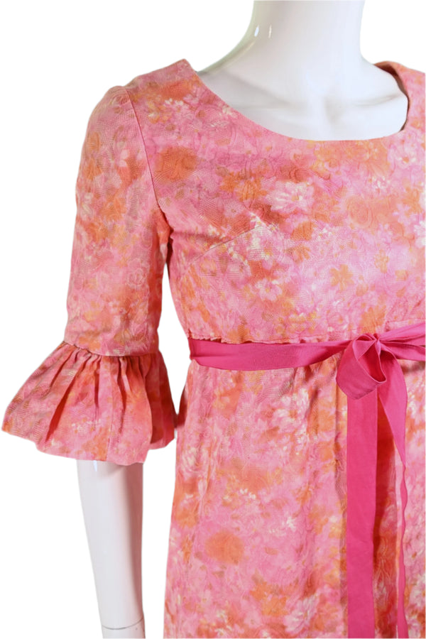 60s Mod Pink Empire Waist Ruffled Sleeve Mini Dress, Junior Teen/Girls