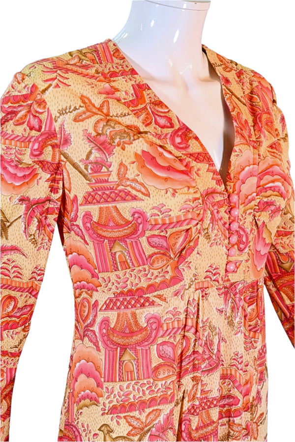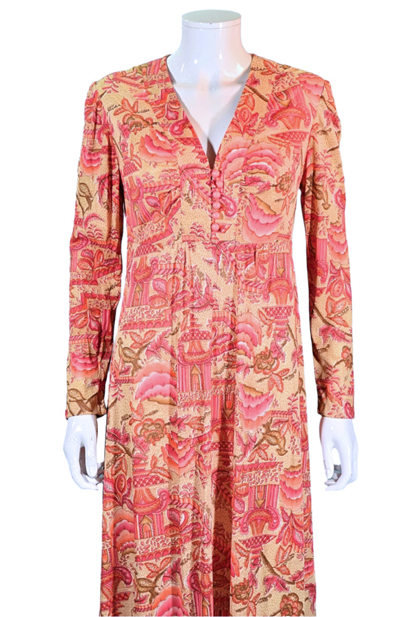 70s Maxi Dress Asian Print Birds Flowers & Pagodas S