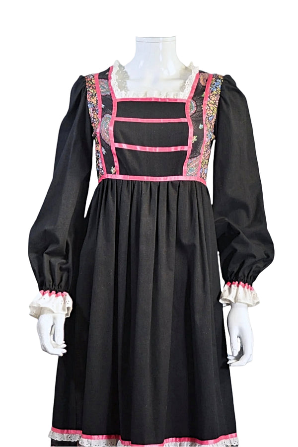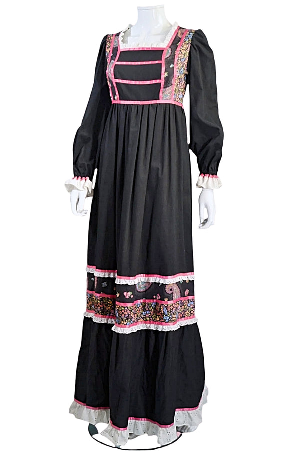 70s Gunne Sax Style Cottagecore Black Floral Prairie Dress S