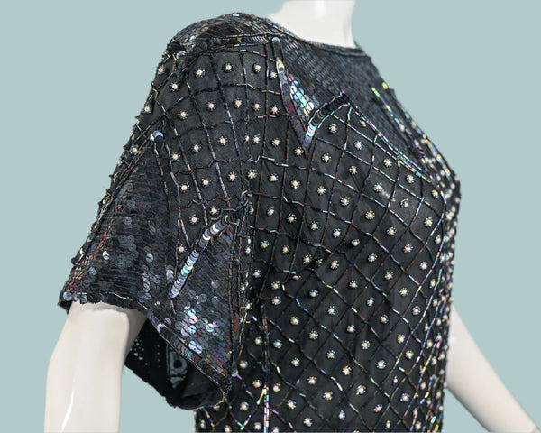 70s Black Silk Beaded/Sequin Top, Relaxed Fit Party Top S