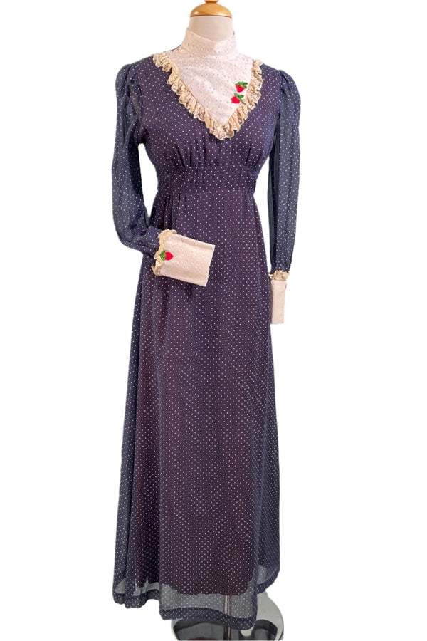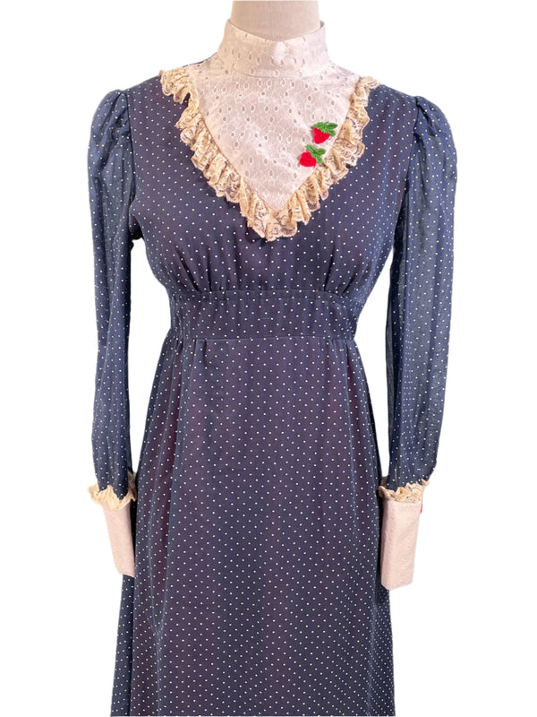 70s Polka Dot Granny Prairie Dress, Grandmillennial Victorian Style Maxi XS/S