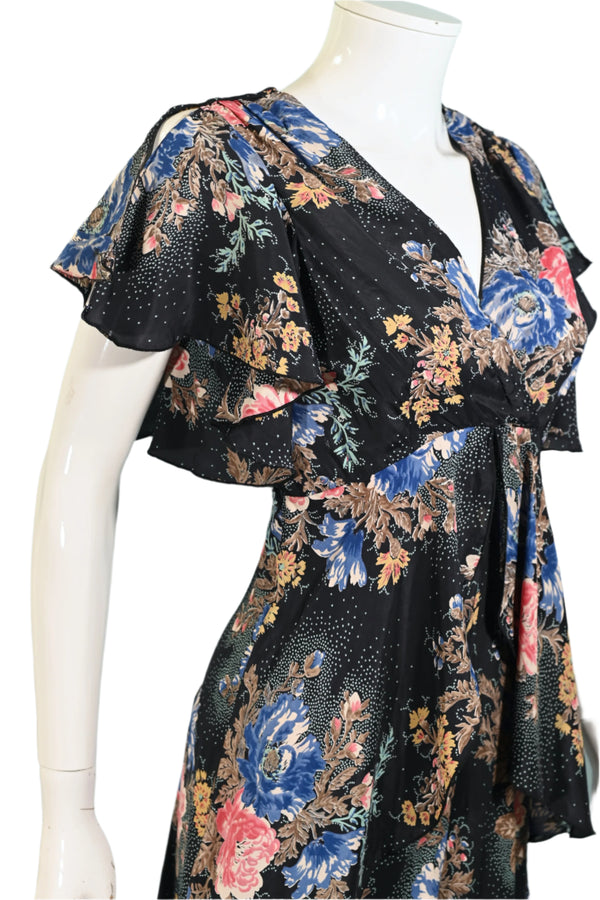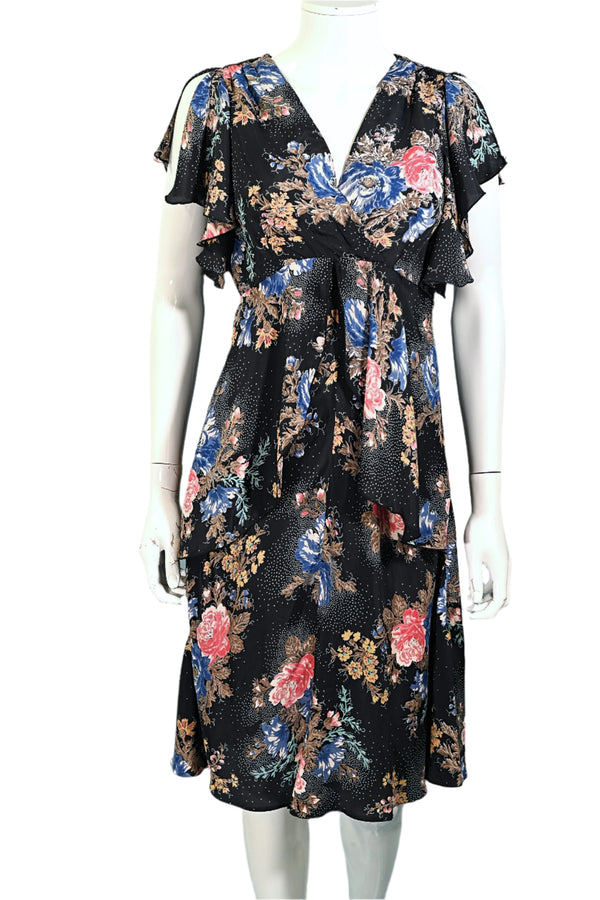 70s Black Floral Dress Flutter Sleeves M