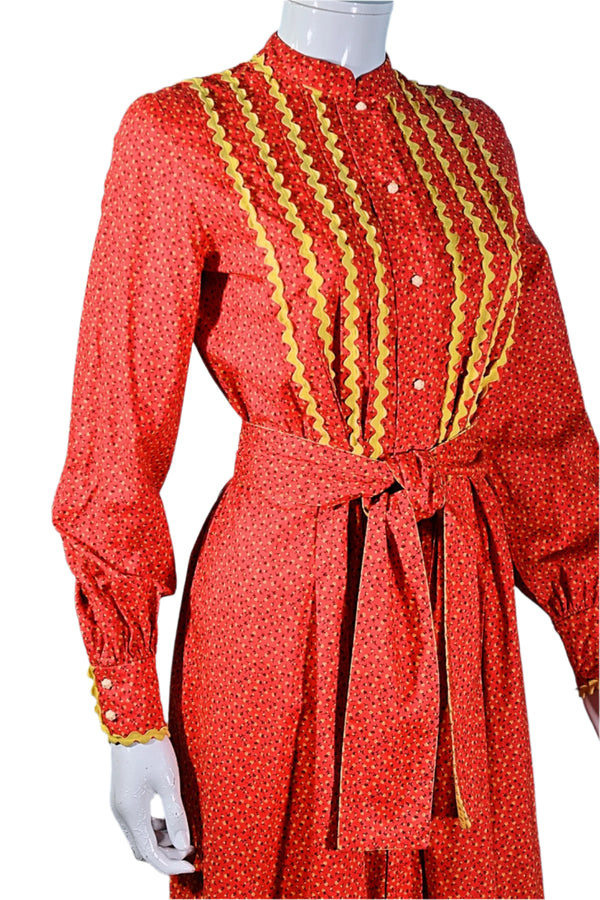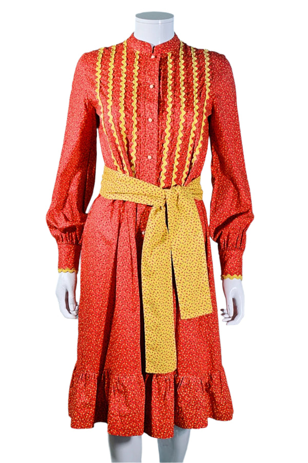60s Prairie Dress, Red/Yellow Calico Print, Fern Violette SZ S