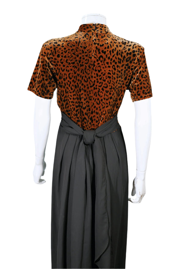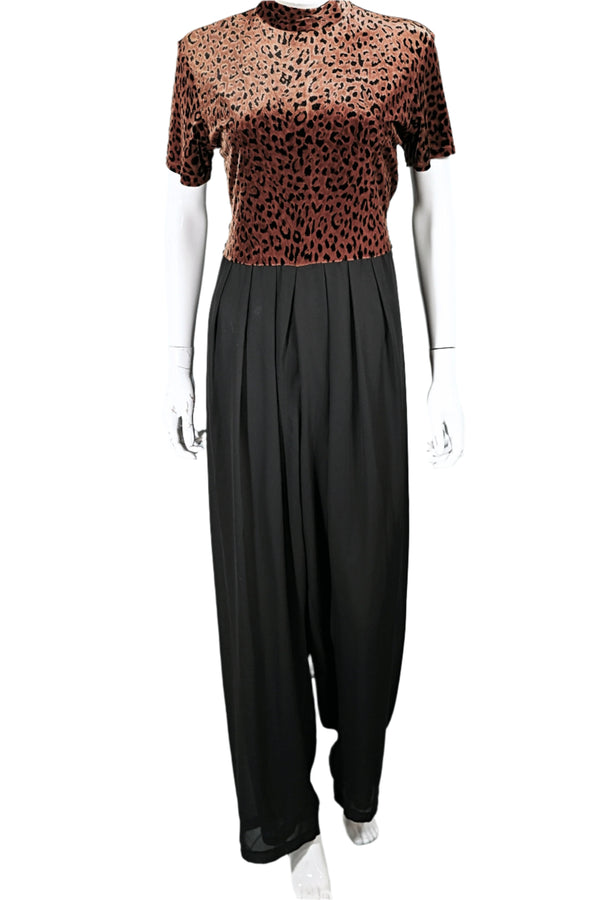 90s CDC Black/Leopard Jumpsuit, Velour Chiffon Jumpsuit + Sash Belt M