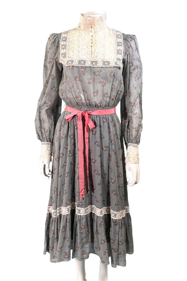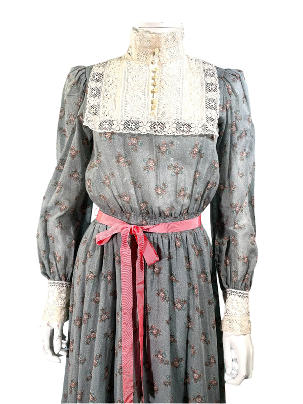 Act 1 70s Victorian Style Prairie Dress, Grey Floral Print S