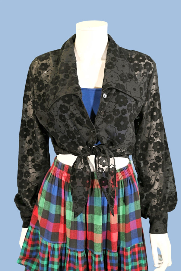 90s Black Sheer Flower Power Cropped Blouse, 70s Style Ties at Waist S