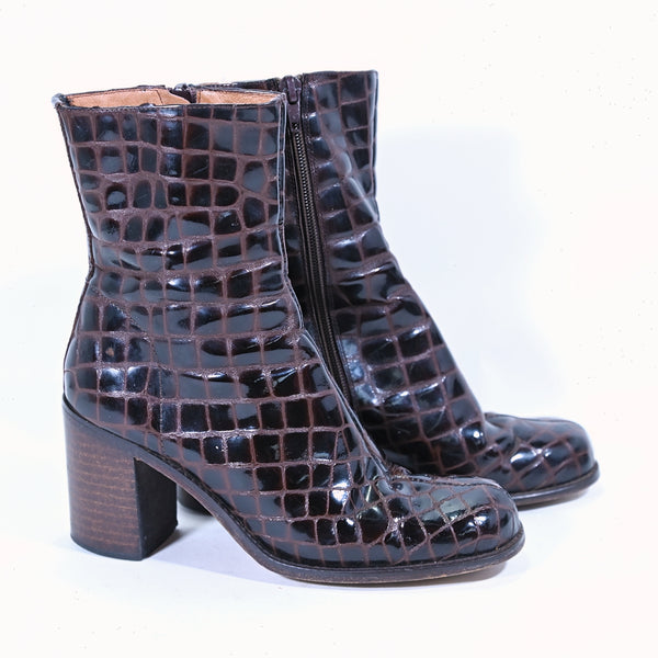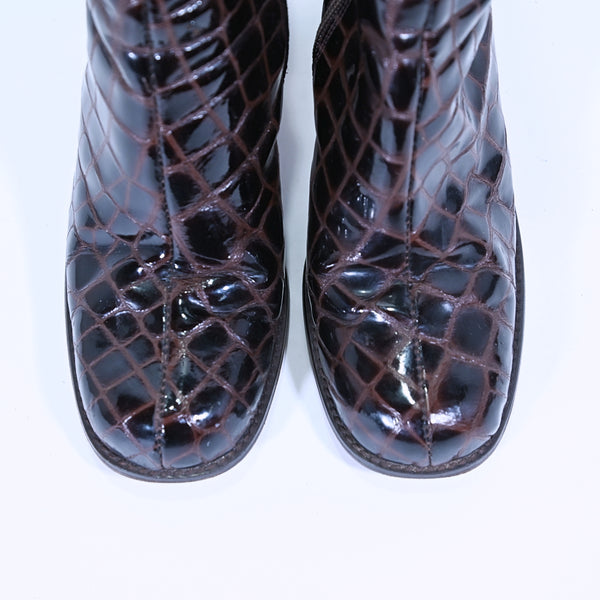 90s GUESS Brown Patent Leather Crocodile Design Boots SZ 7.5