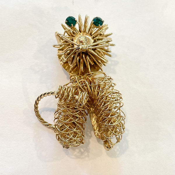 Adorable MCM Modernist Gold Tone Cat Brooch, Wire Pin Green Rhinestone Eyes