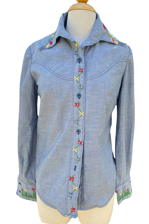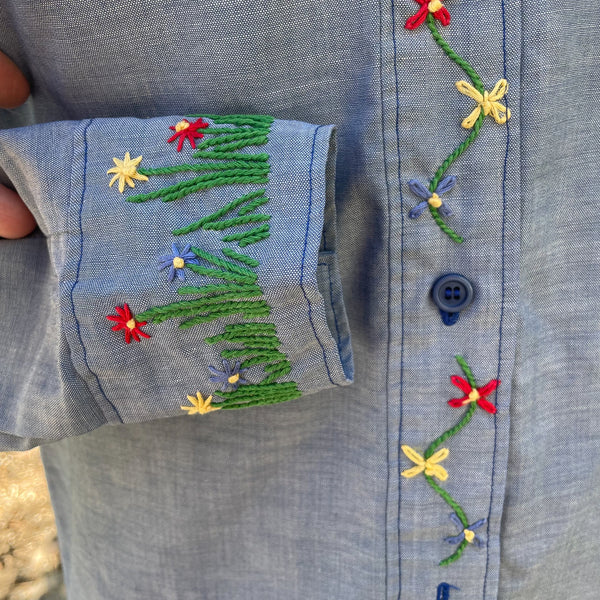 Vintage 60s/70s Hand Embroidered Chambray Blouse, Hippie Cottagecore Top S
