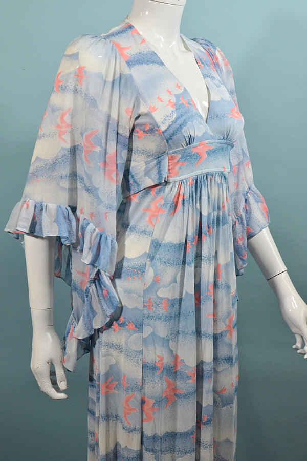 Vintage Angel Sleeve Maxi Dress, Birds Clouds Hippie Boho Dress XS