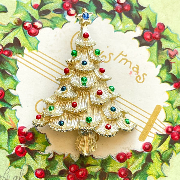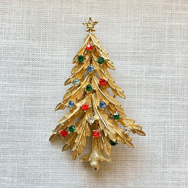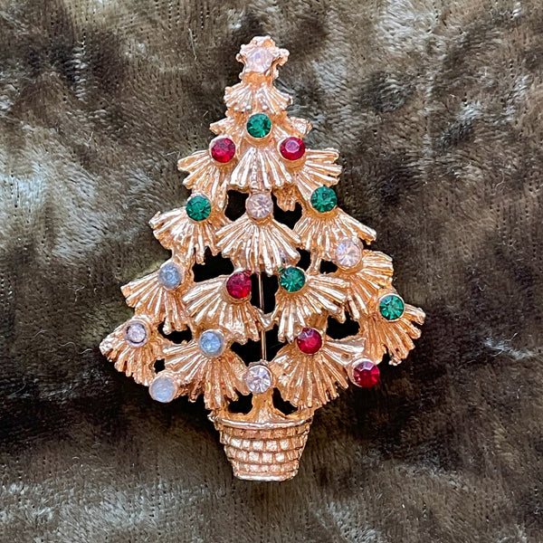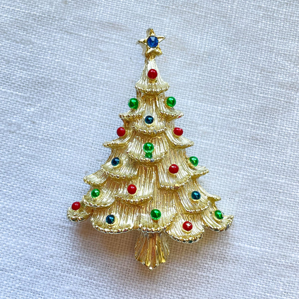 Vintage MCM Christmas Tree Brooch, Gold Tone Costume Jewelry