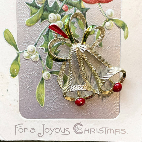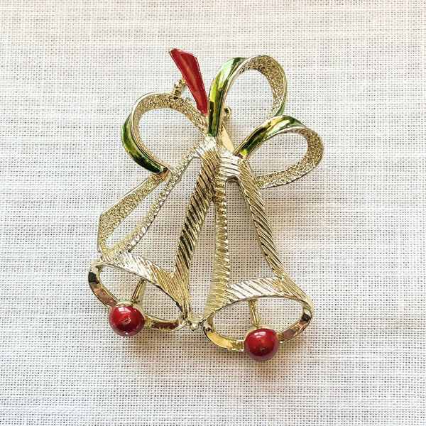 Vintage MCM Christmas Bells Brooch, Gold Tone Costume Jewelry by Gerrys