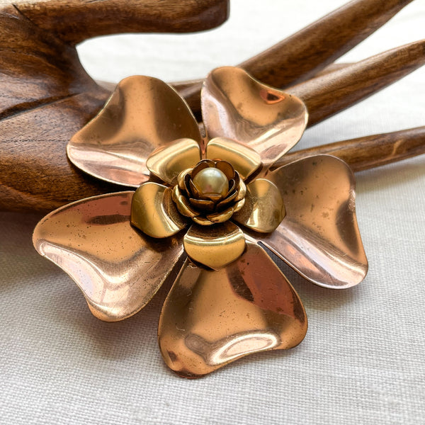 Vintage MCM Copper Flower Brooch, Mixed Metals Faux Pearl Pin