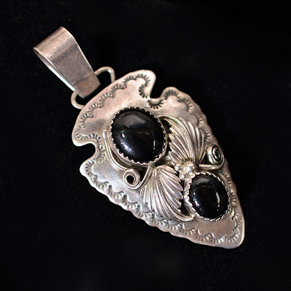 Vintage Navajo Sterling Silver Onyx Arrowhead Pendant, Swirls +Leaf Details, Signed A 10.9 Grams