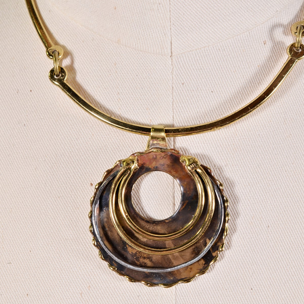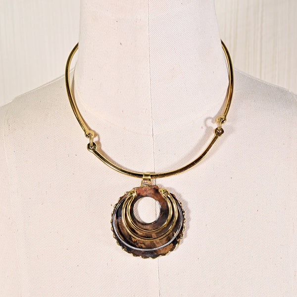 Vintage Modernist Circle Pendant Faux Tortoise Shell on Brass Choker Necklace