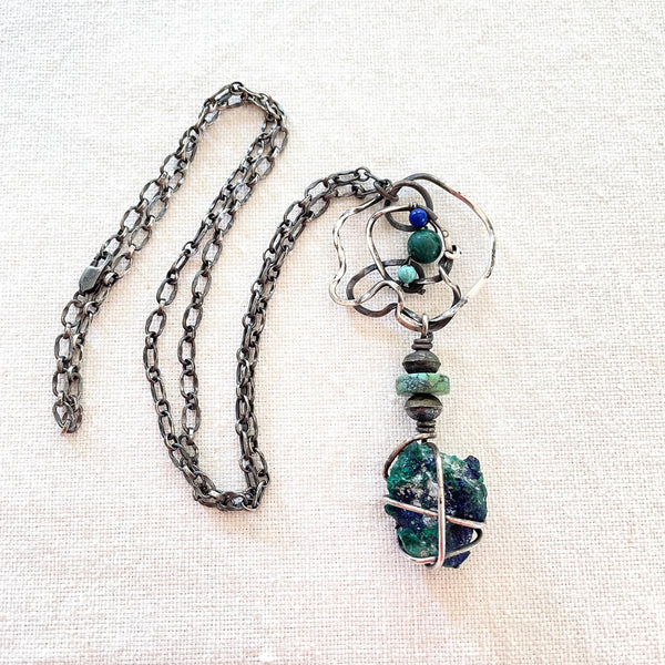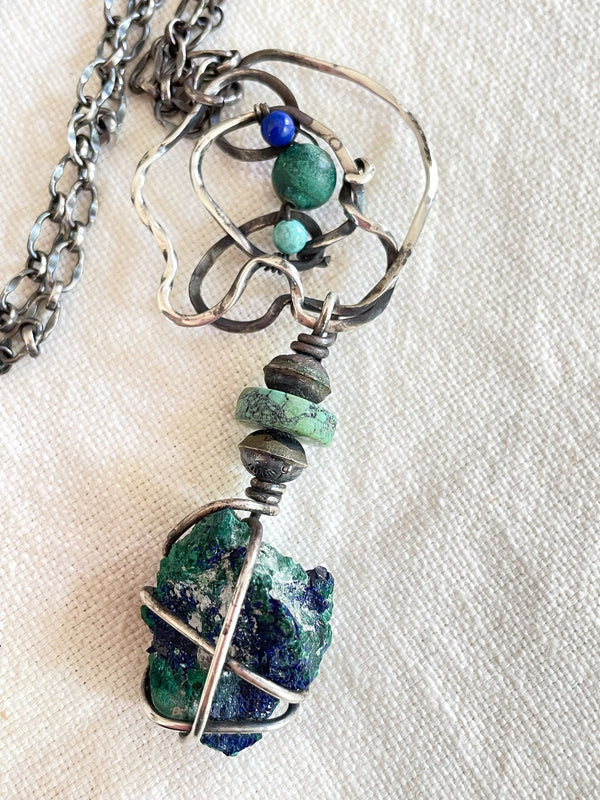 Vintage Sterling Artisan Made Abstract Brutalist Modernist Necklace, Azure Malachite Pendant