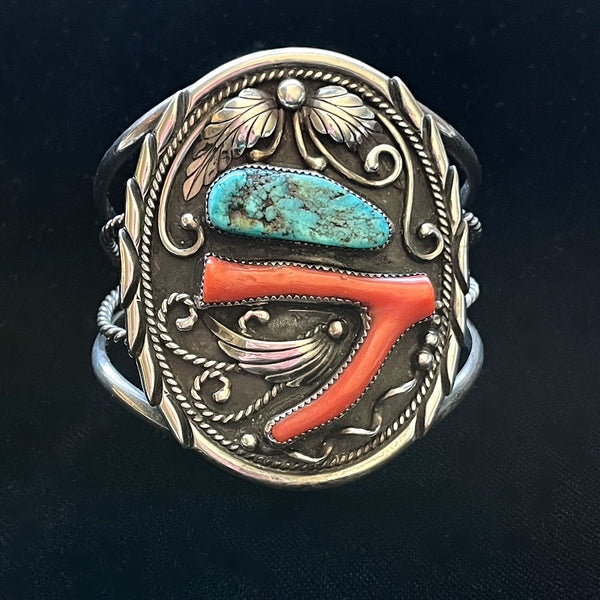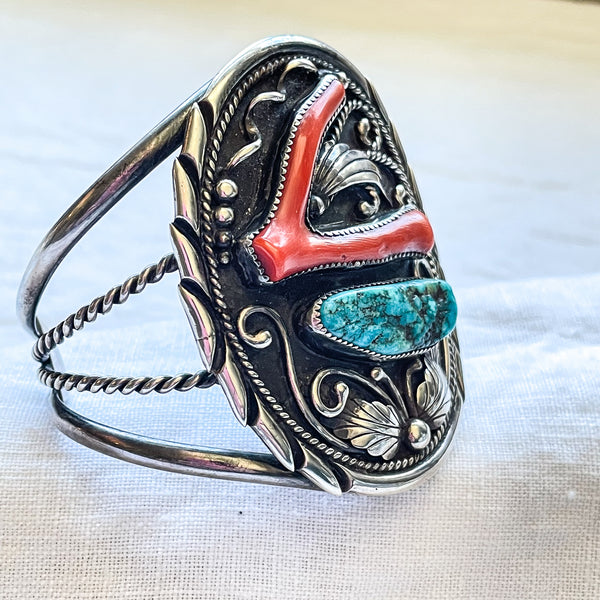 Vintage Sterling Silver Native American Bracelet, Turquoise Coral Statement Cuff Signed LJ