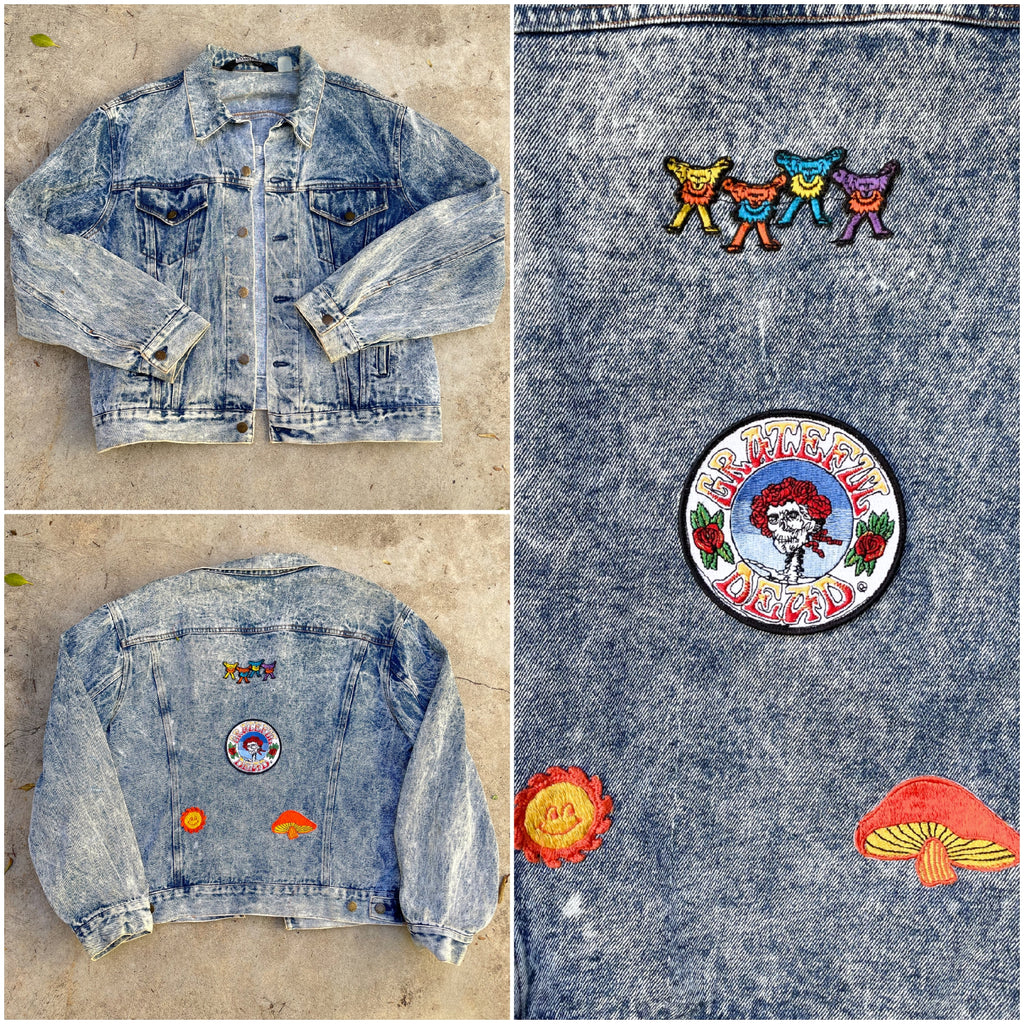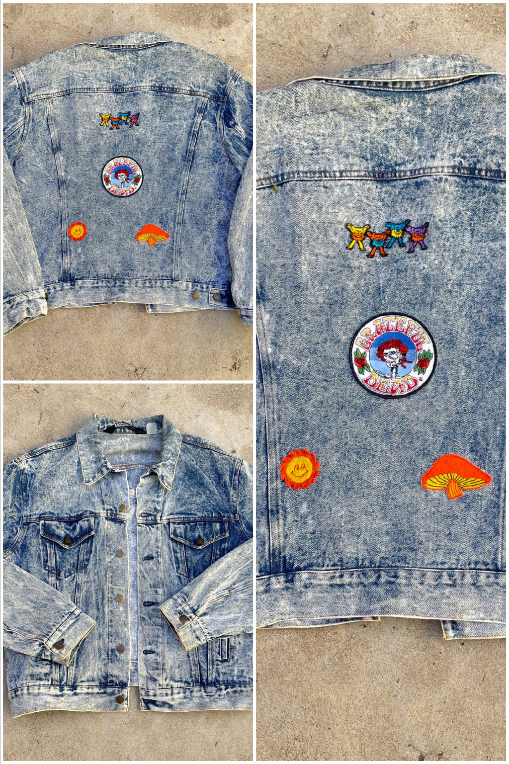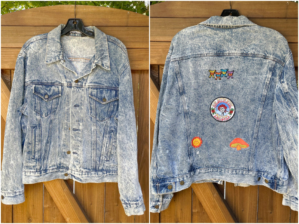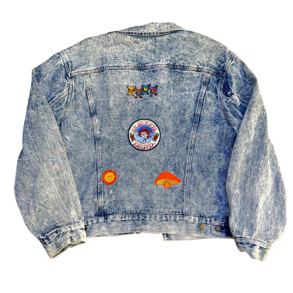 Vintage 80s acid washed denim jacket with Grateful Dead patches on the back.