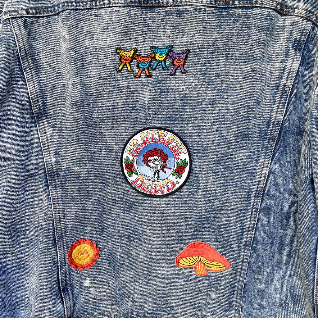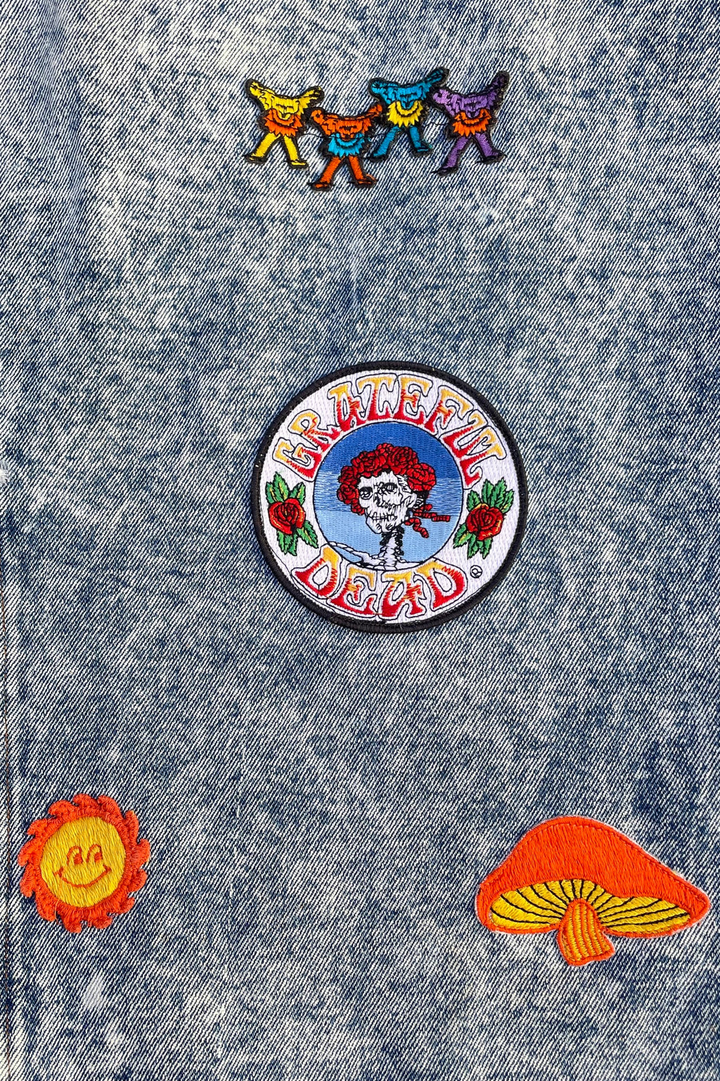 Patches include: Grateful dead w/skull & roses, Grateful dead dancing bears, mushroom, smiling sun.
