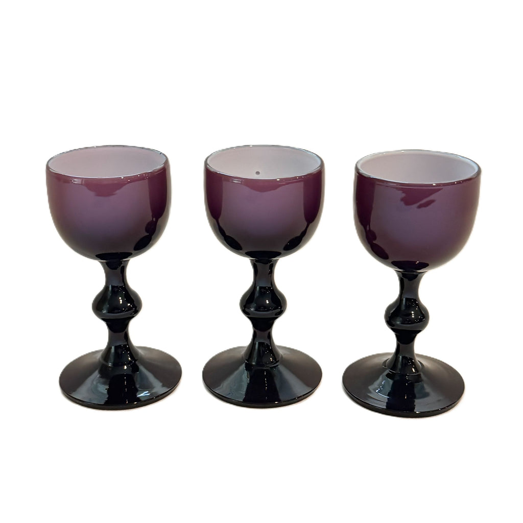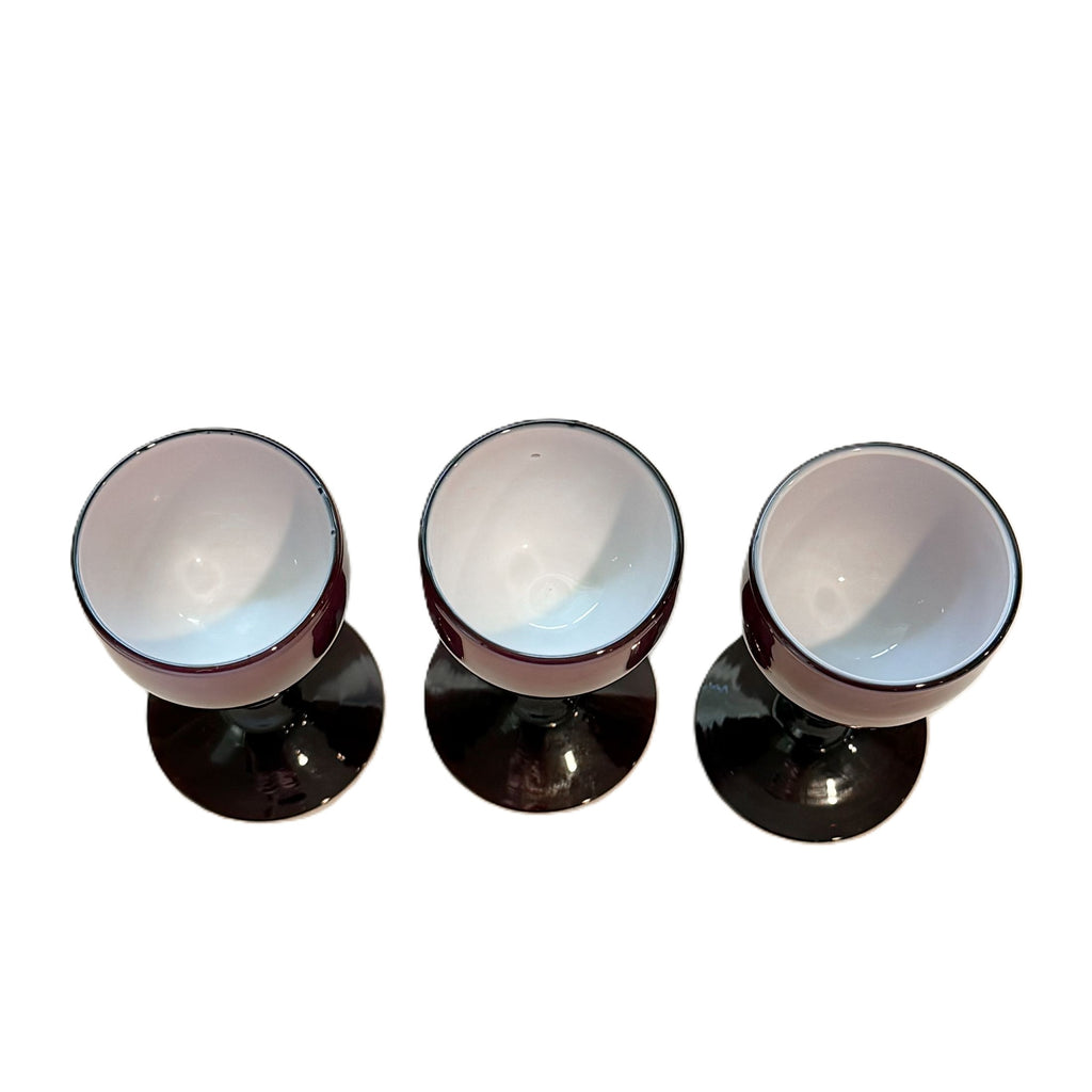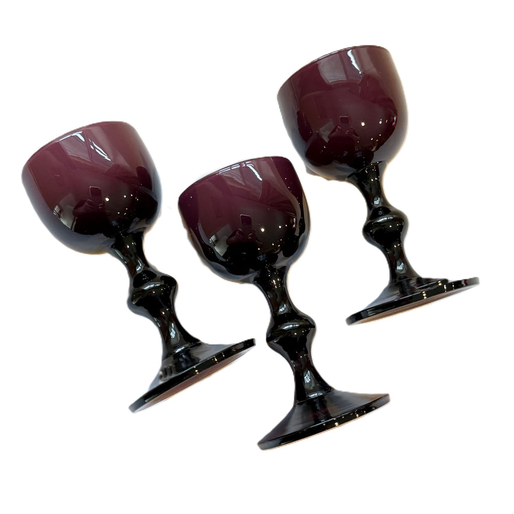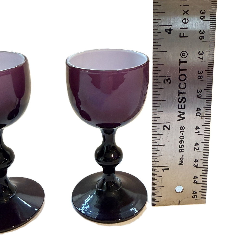 Vintage burgundy cased glass Carlo Moretti cordial glasses.